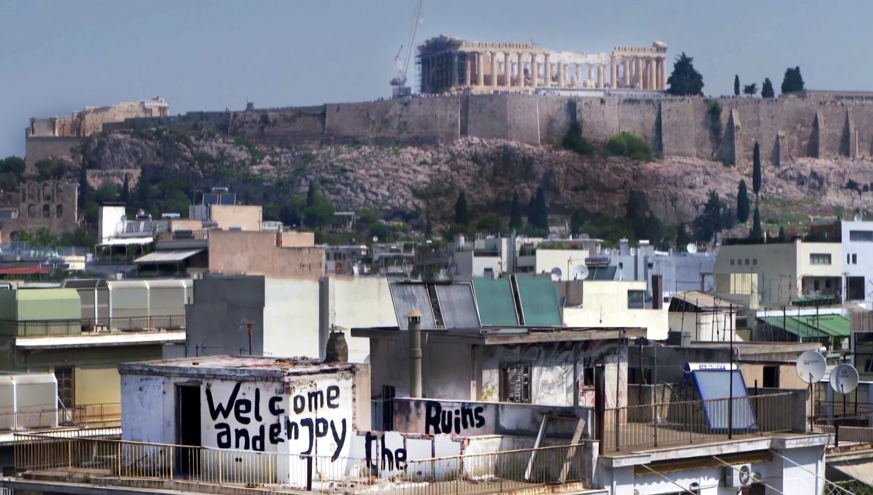 Ersi Sotripoulos, a writer featured in the film, states that, ‘crisis breeds apathy’, and the world eventually writes off historical events in favour of forgetting or ignoring them. To make matters worse, the debt crisis resulted in a binary of “good” and “bad” Europeans, as journalist Paul Mason states in the documentary. It was not only the Greek economy and democracy that was impacted during the crisis, but the cultural legacy of Greece was attacked too. Public Enemy allows not only former government officials and journalists to comment on the matter but the general public too, with artists like Depsina Xenou.